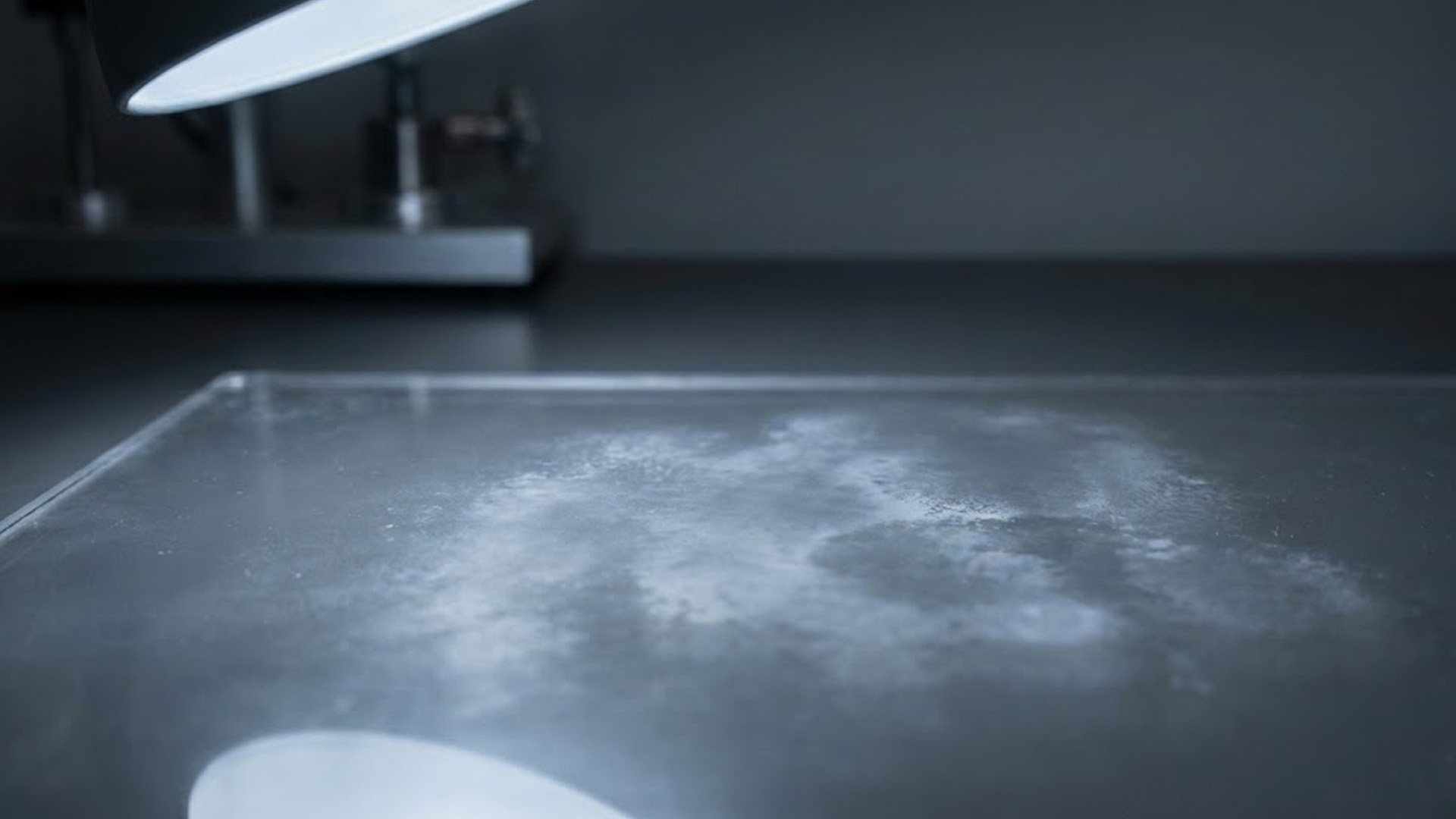 Durante a cura, o endurecedor reage com a umidade do ar e CO₂, formando carbamato de amônio, que deposita na superfície.